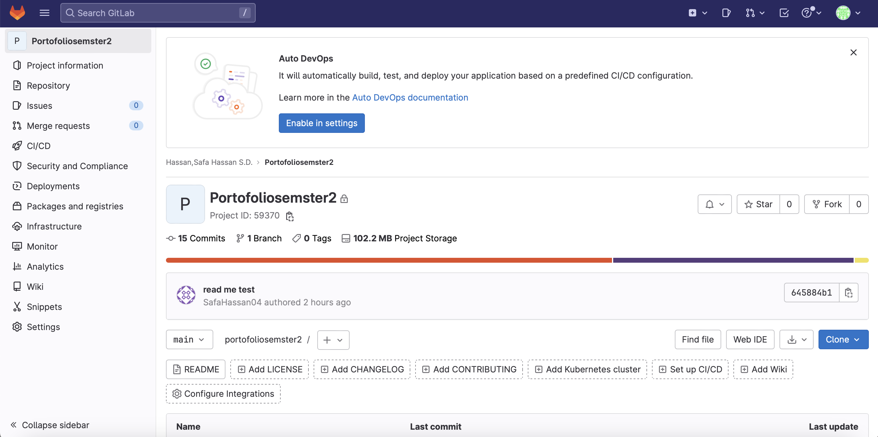We begonnen met het opzetten van een groepsproject op GitLab om samen aan een project te werken. Aangezien we allemaal nieuw waren met het werken in een gedeeld Git-project, liepen we tegen enkele uitdagingen aan. Een belangrijk probleem was dat we geen aparte branches hadden gemaakt, waardoor we allemaal gelijktijdig aan de hoofdversie werkten. Dit leidde tot verwarring en per ongeluk overschreven we elkaars werk. Ook gebruikten we niet de terminal om wijzigingen op te slaan, wat eigenlijk efficiënter zou zijn geweest.