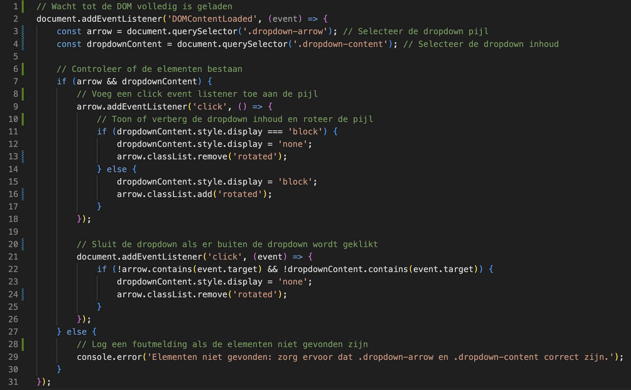 Ik heb een JavaScript-functie geschreven die wacht tot de DOM volledig is geladen en daarna een klikbare dropdown creëert. Wanneer er op de pijl van de dropdown wordt geklikt, wordt de dropdown-inhoud getoond of verborgen en wordt de pijl geroteerd. De dropdown sluit automatisch als er buiten de dropdown wordt geklikt. Dit is te vinden opgit.