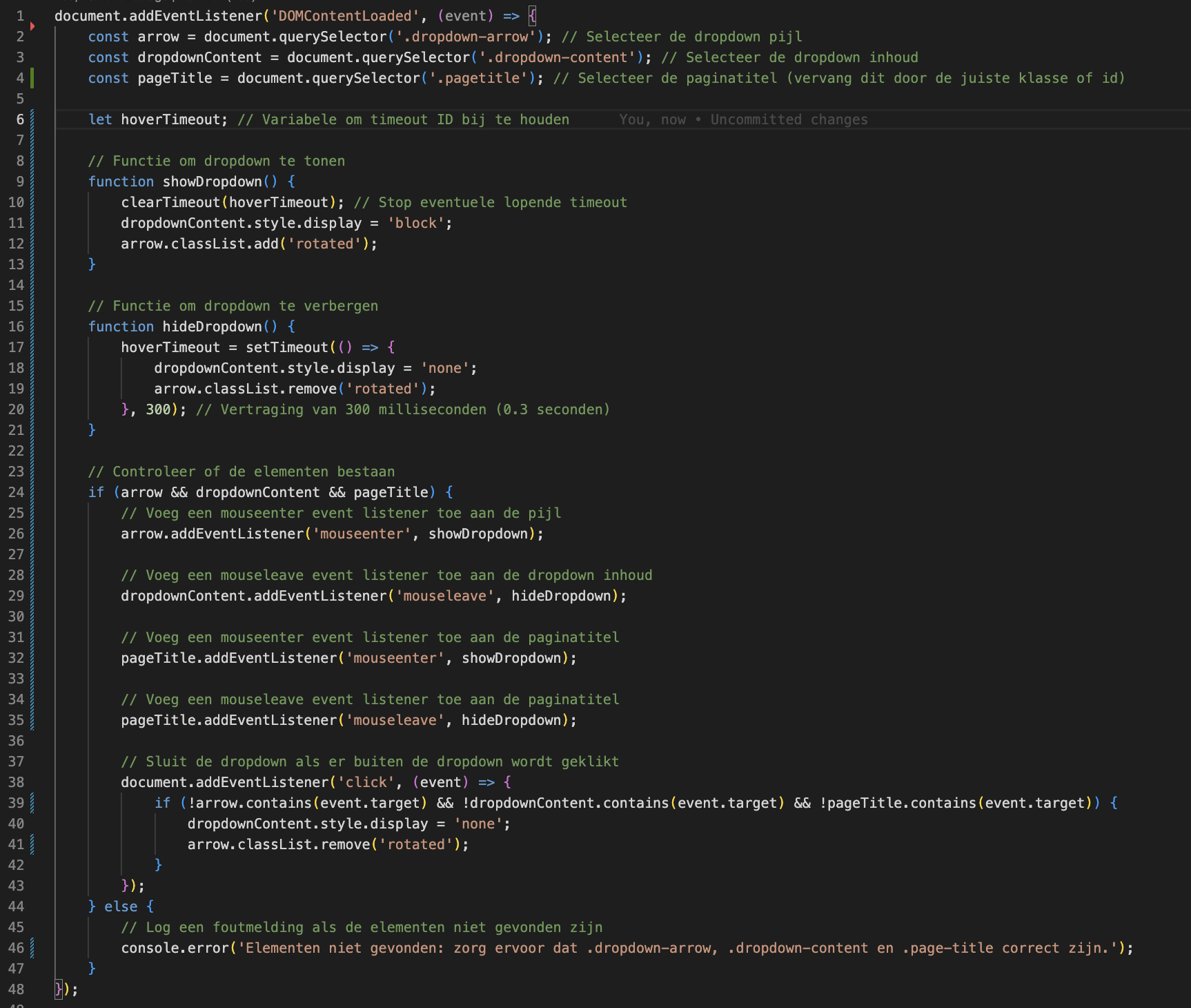 Deze nieuwe JavaScript-code zorgt ervoor dat een dropdown-menu wordt getoond en verborgen op basis van hover- en klikgebeurtenissen. Gebruikers kunnen de dropdown activeren door over de pijl of de paginatitel te hoveren. De dropdown blijft zichtbaar zolang de muis zich binnen de dropdown of het geactiveerde element bevindt. Klikken buiten de dropdown sluit deze weer. Dit verbetert de gebruikerservaring door een intuïtieve bediening van de dropdown-menu's mogelijk te maken op verschillende interactiepunten op de pagina. Dit is te vinden opgit.
