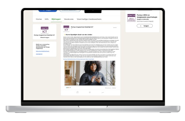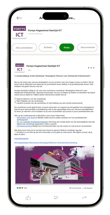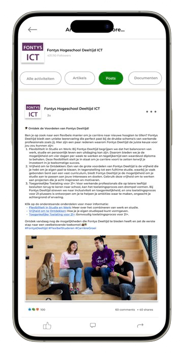 Omdat ik had opgemerkt dat Fontys al een LinkedIn-account heeft, maar dat de informatie en content niet relevant zijn voor deeltijdstudenten, heb ik besloten om een LinkedIn-account speciaal voor deeltijdstudenten te ontwerpen. Vervolgens heb ik onderzocht welke content geschikt zou zijn voor OVP-studenten en ben ik met verschillende ideeën gekomen om meer studenten aan te trekken. De gekozen posts zijn: